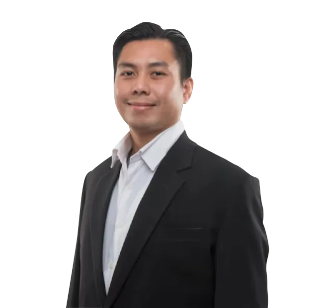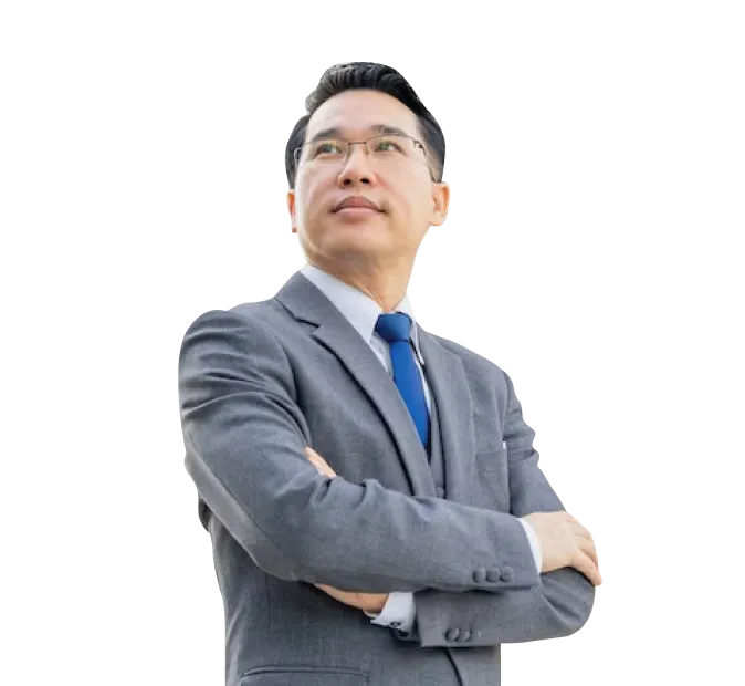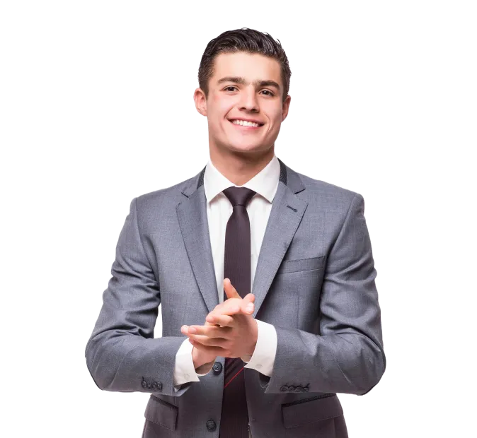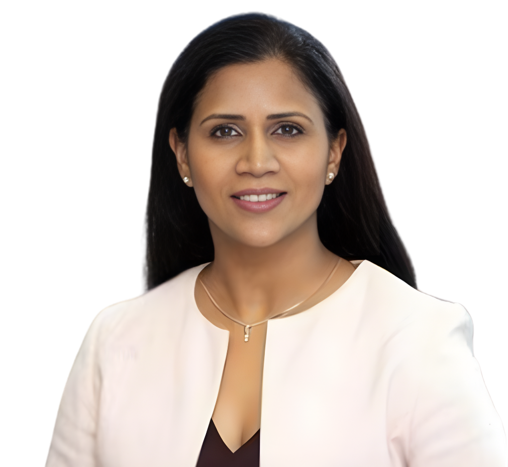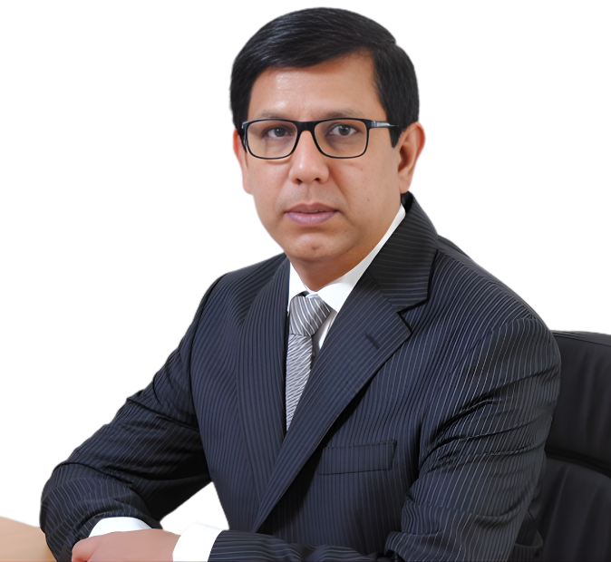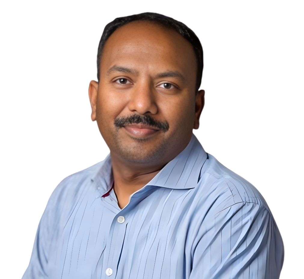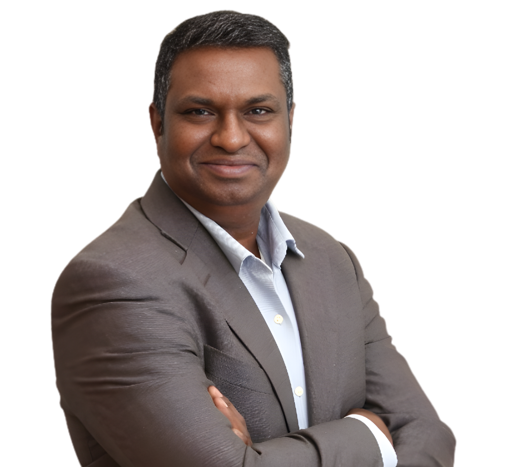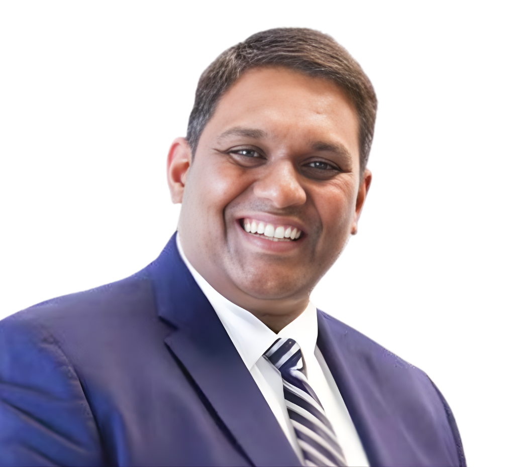 Realistic portrait of a confident Indian-origin male professional in formal suit standing against a soft blue corporate background, subtle digital-tech pattern.